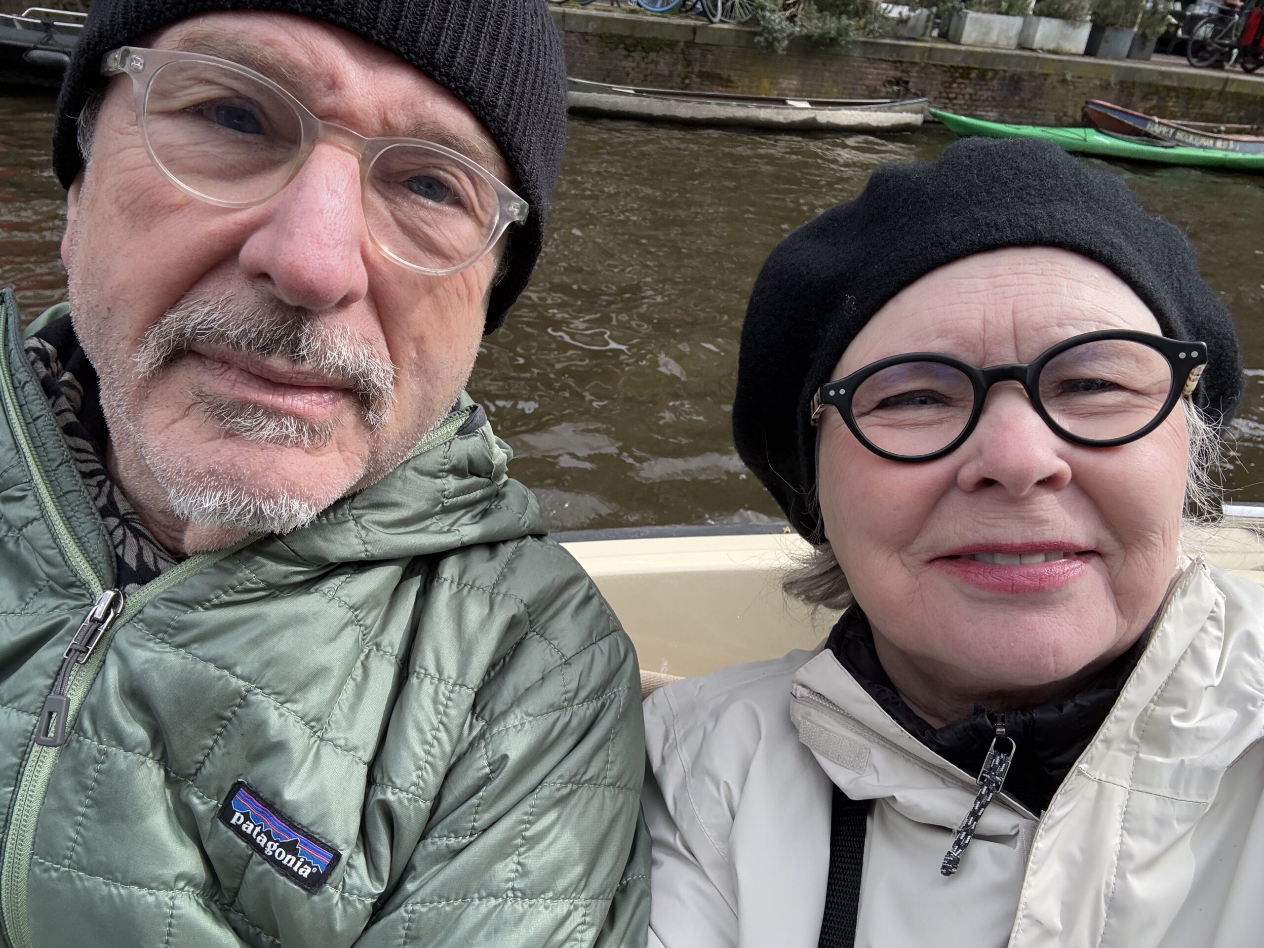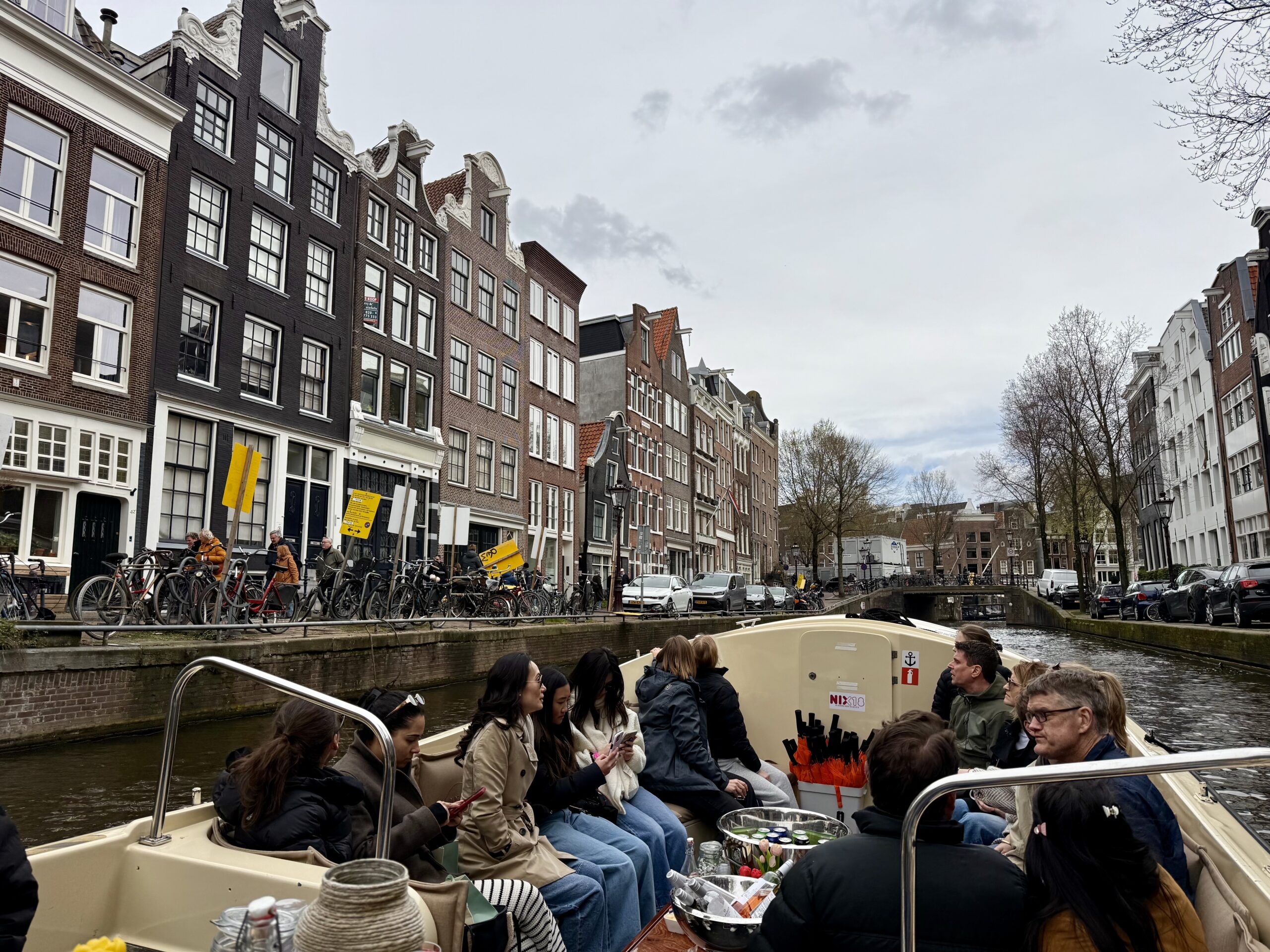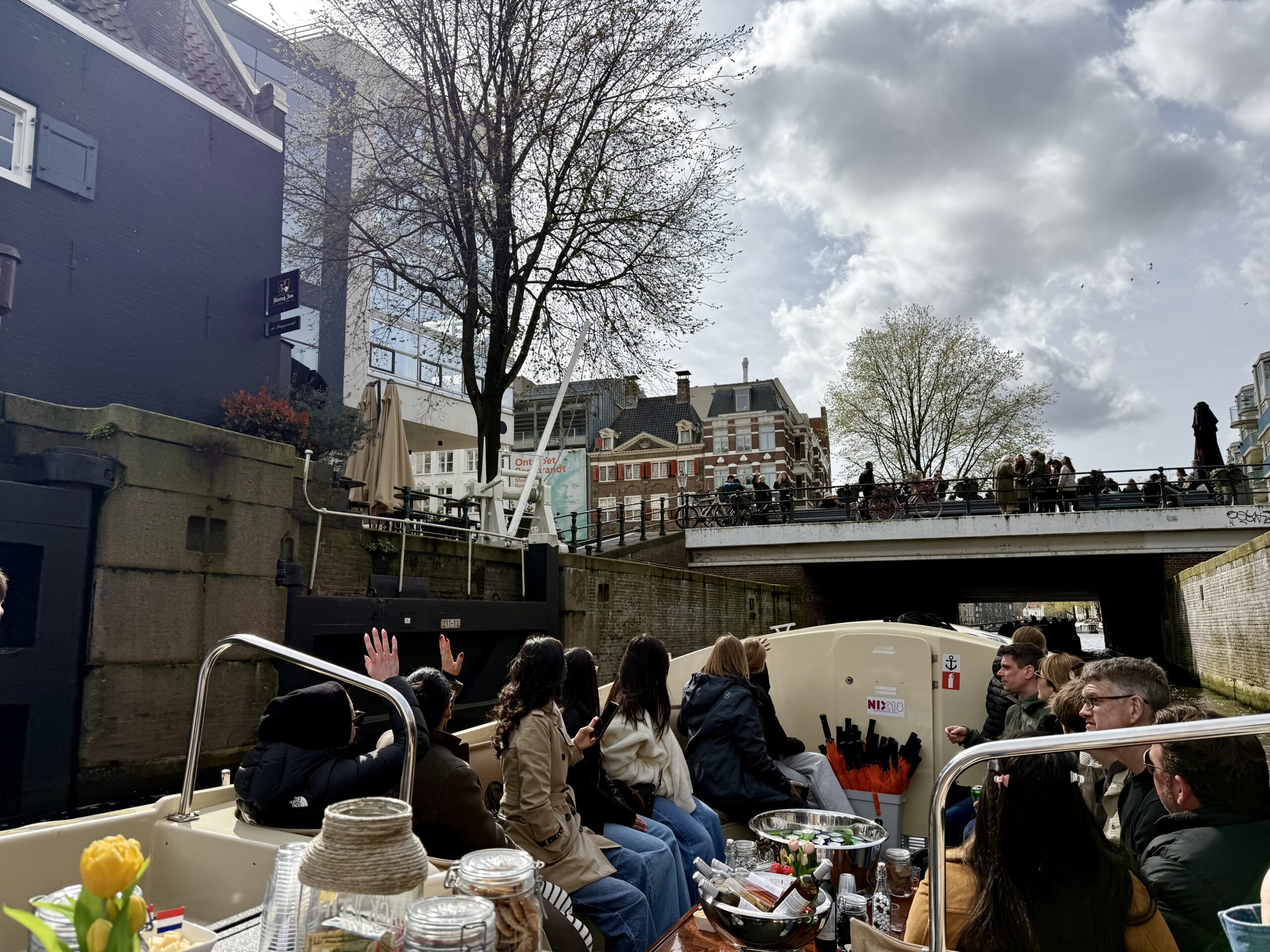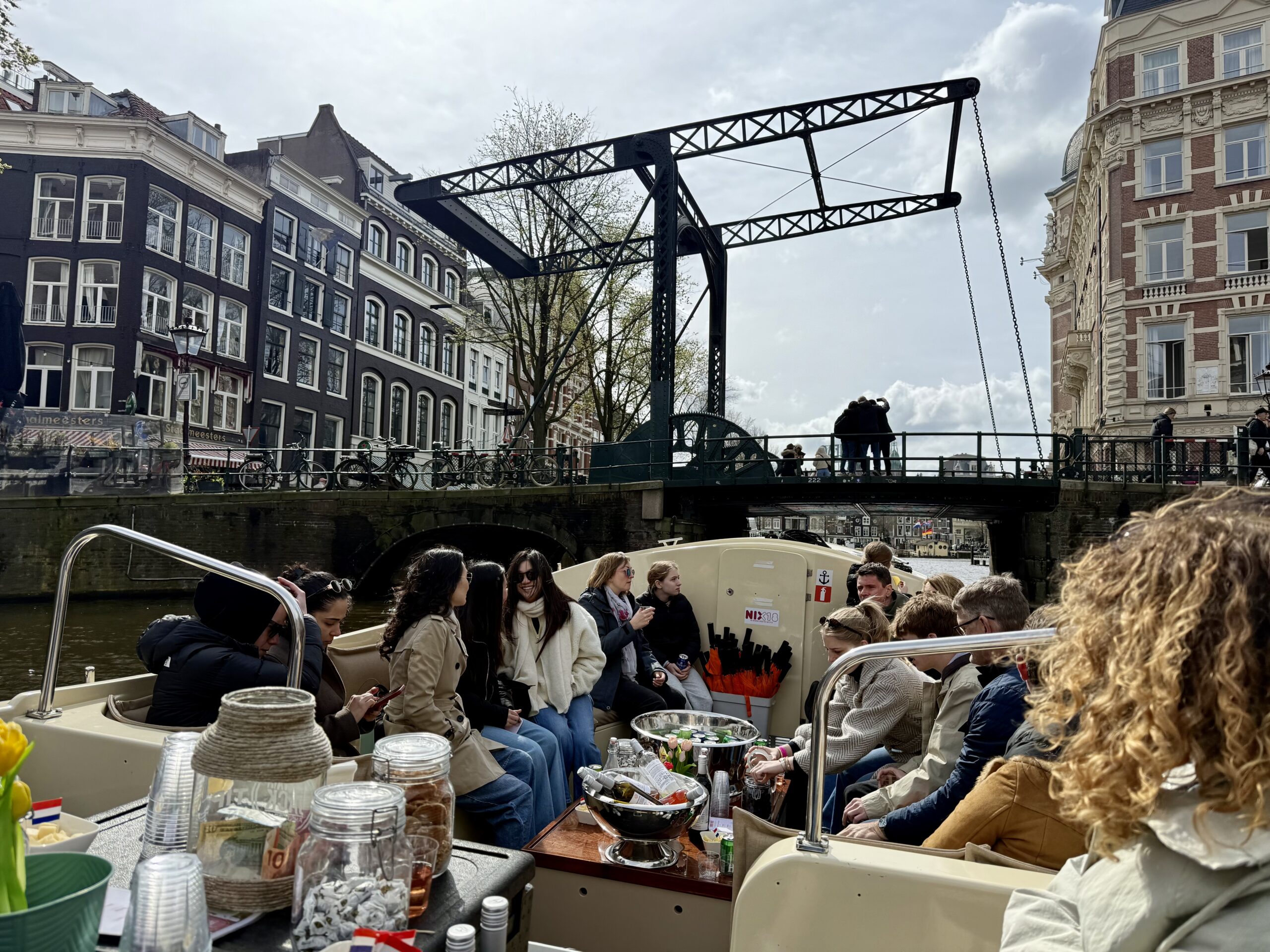 Bonnie loves a boat ride. Our excellent 90-minute canal tour started near Central Station. The weather was better than expected for an open boat, which was well supplied with wine and snacks. Captain DJ offered dad jokes along with well-informed observations on Amsterdam history. His narrative ranged from accounts of the original stock exchange to stories about the Rolling Stones. He also pointed out the bridge where Rebecca (of Ted Lasso) fell into the canal and met the handsome Dutch man. (Bonnie had been looking for it.)