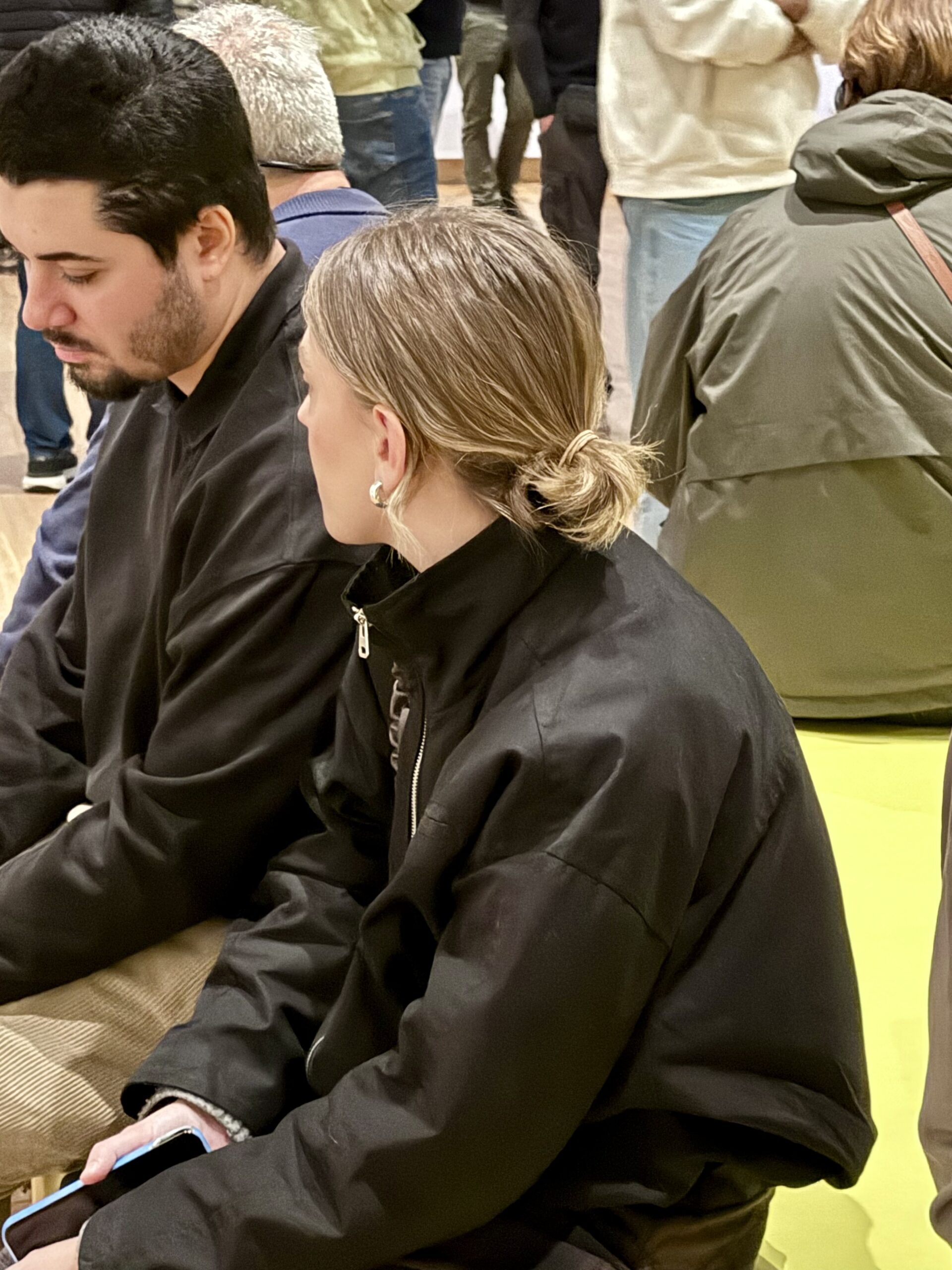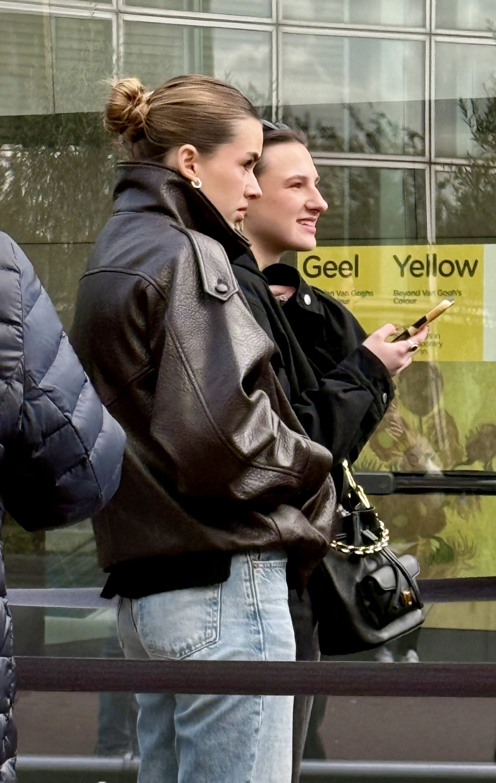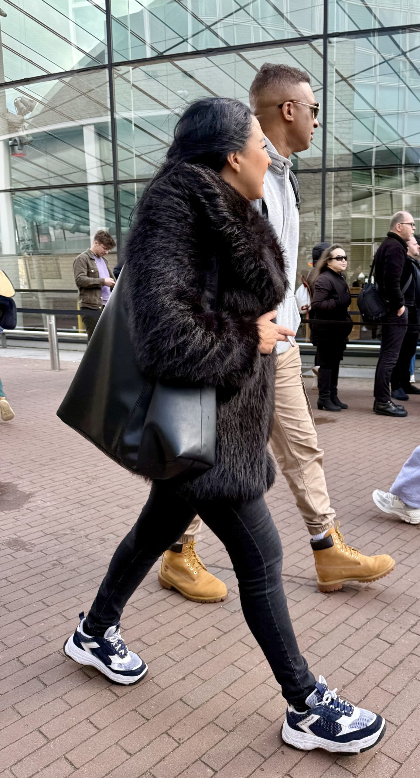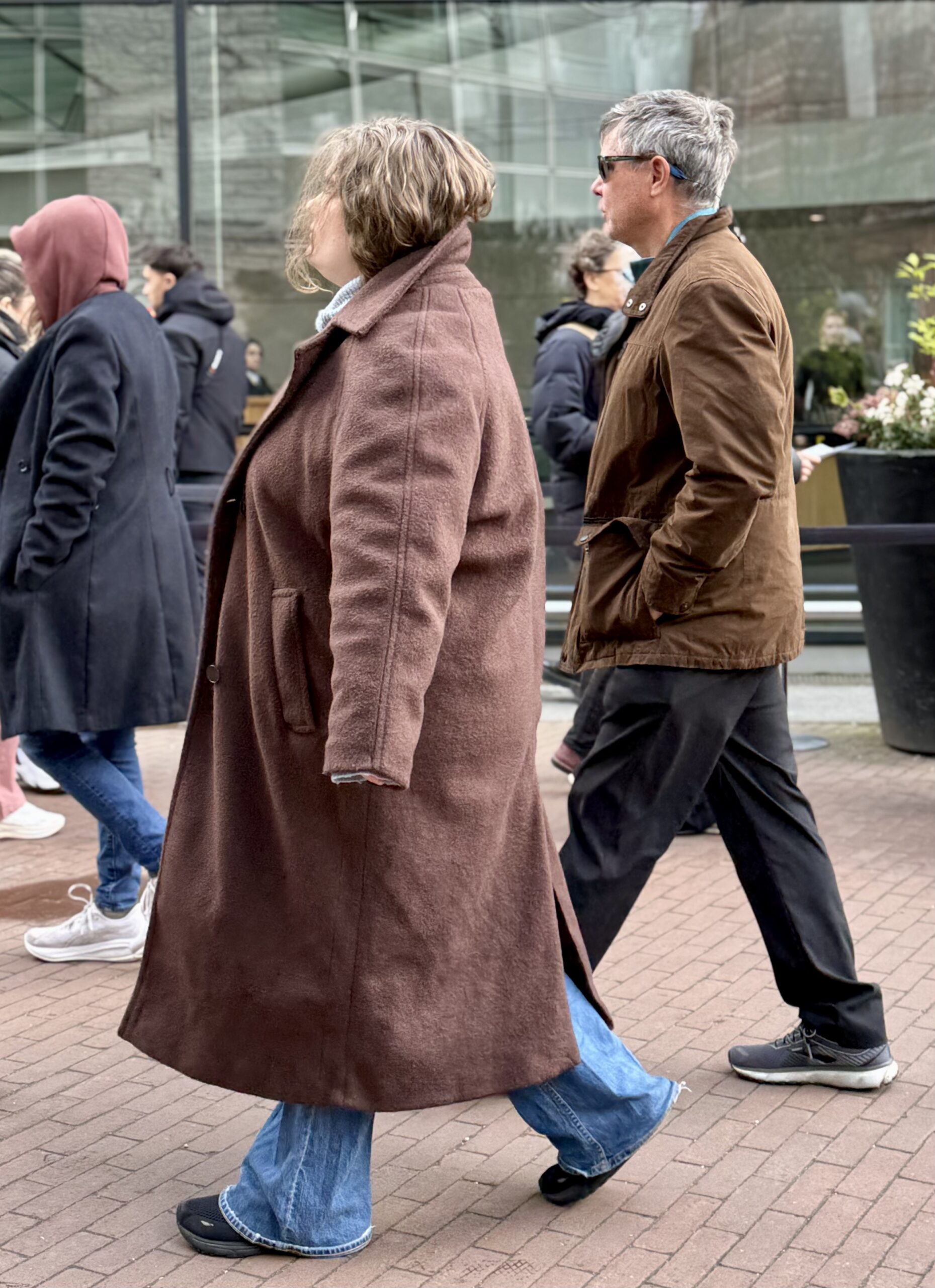 Especially for Diana and Alicia. In addition to puffy coats and North Face parkas, lots of lovely, long wool coats on men and women, often in chocolate brown or oatmeal. All kinds of fuzzy, furry jackets. Heavy, black leather, laced boots. Hair in high ballet buns. Wide-legged trousers on men and women.