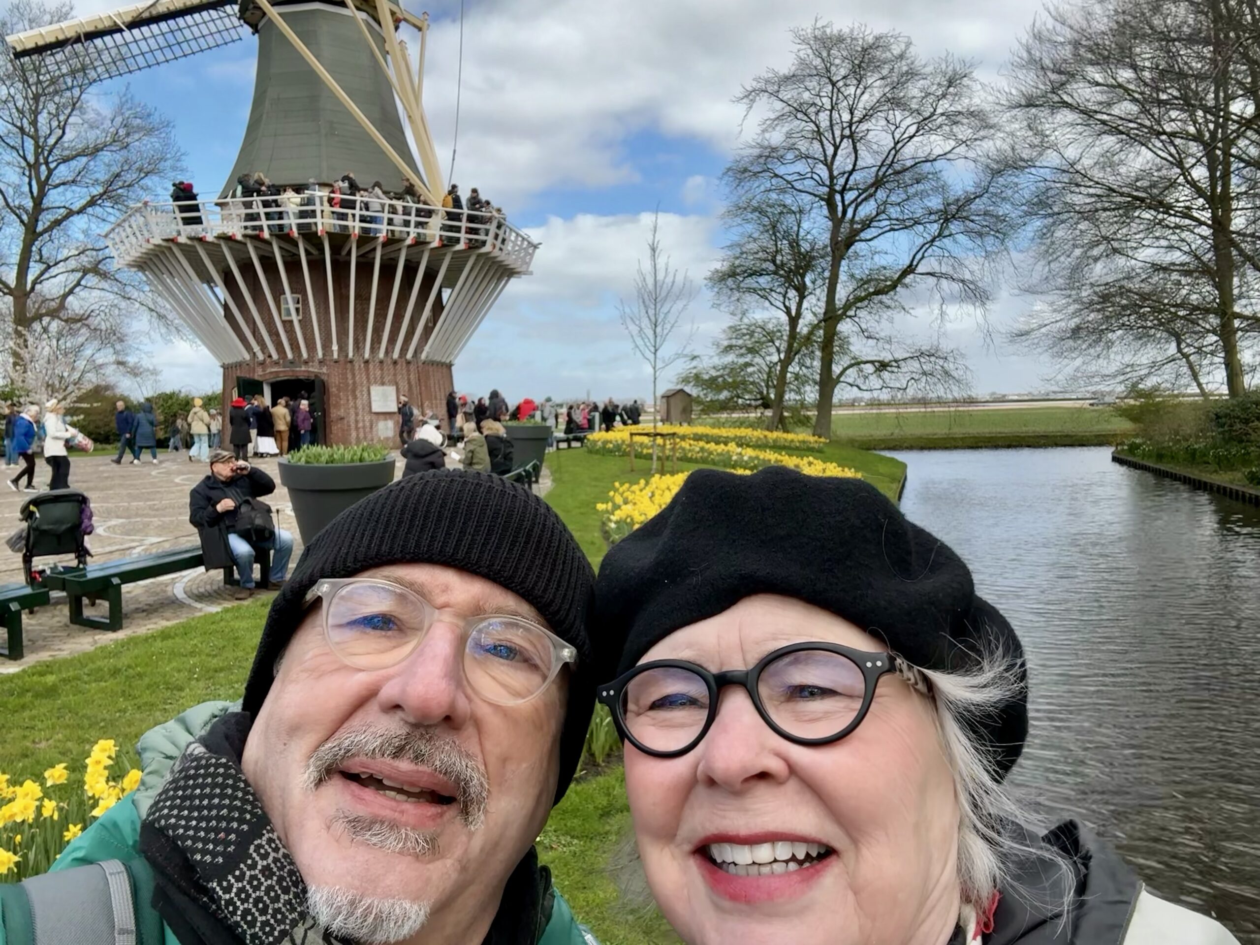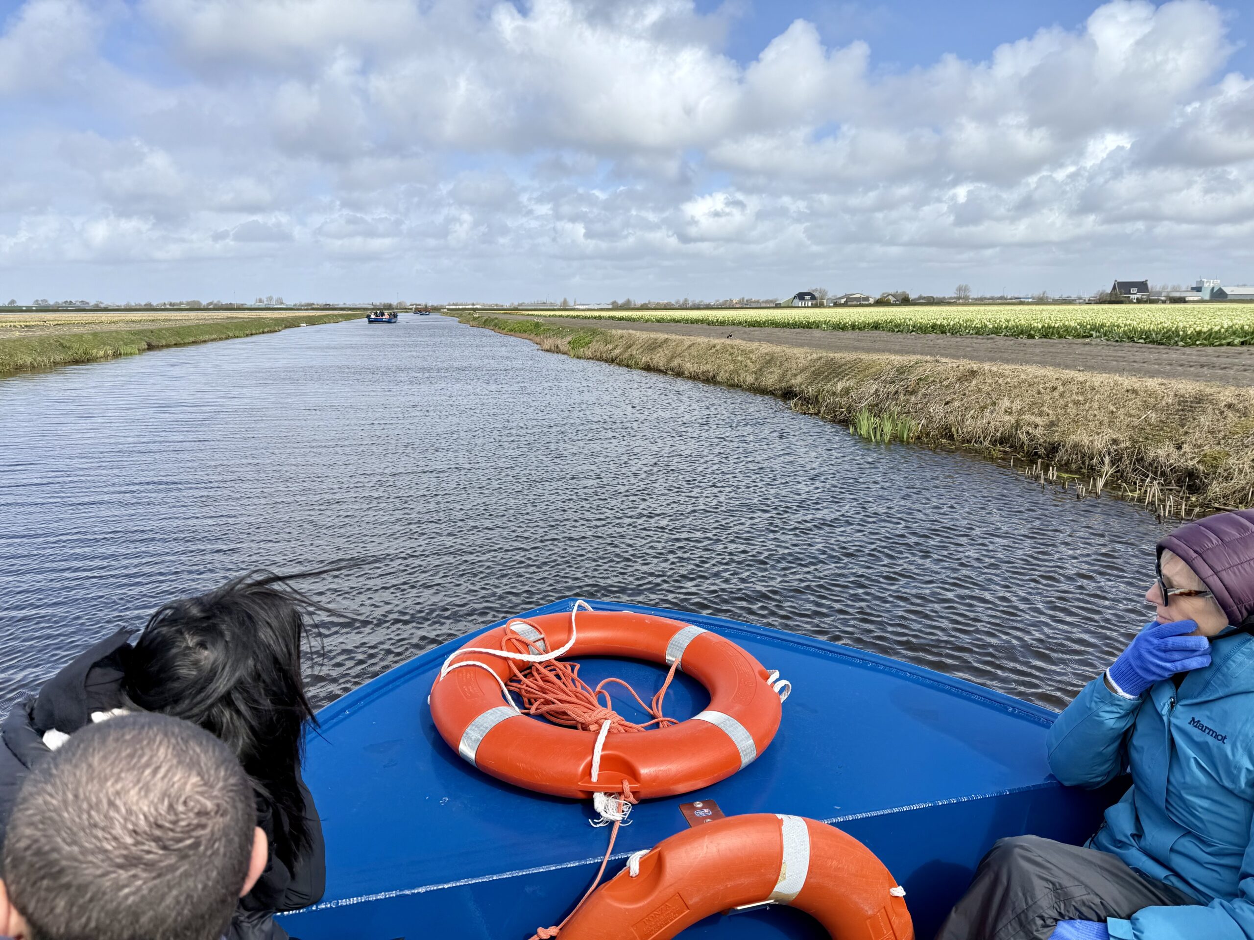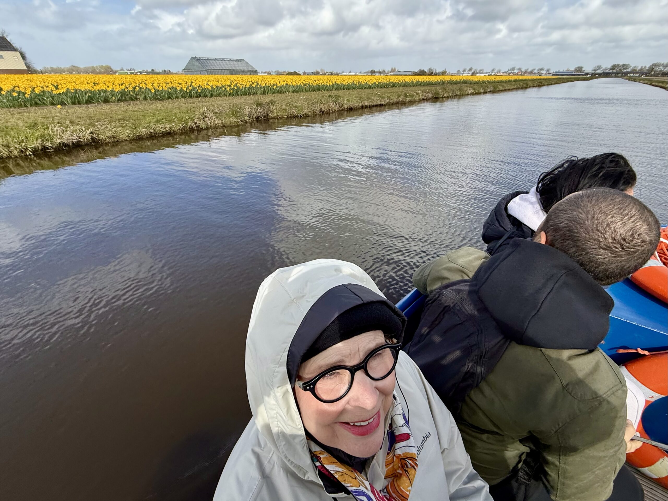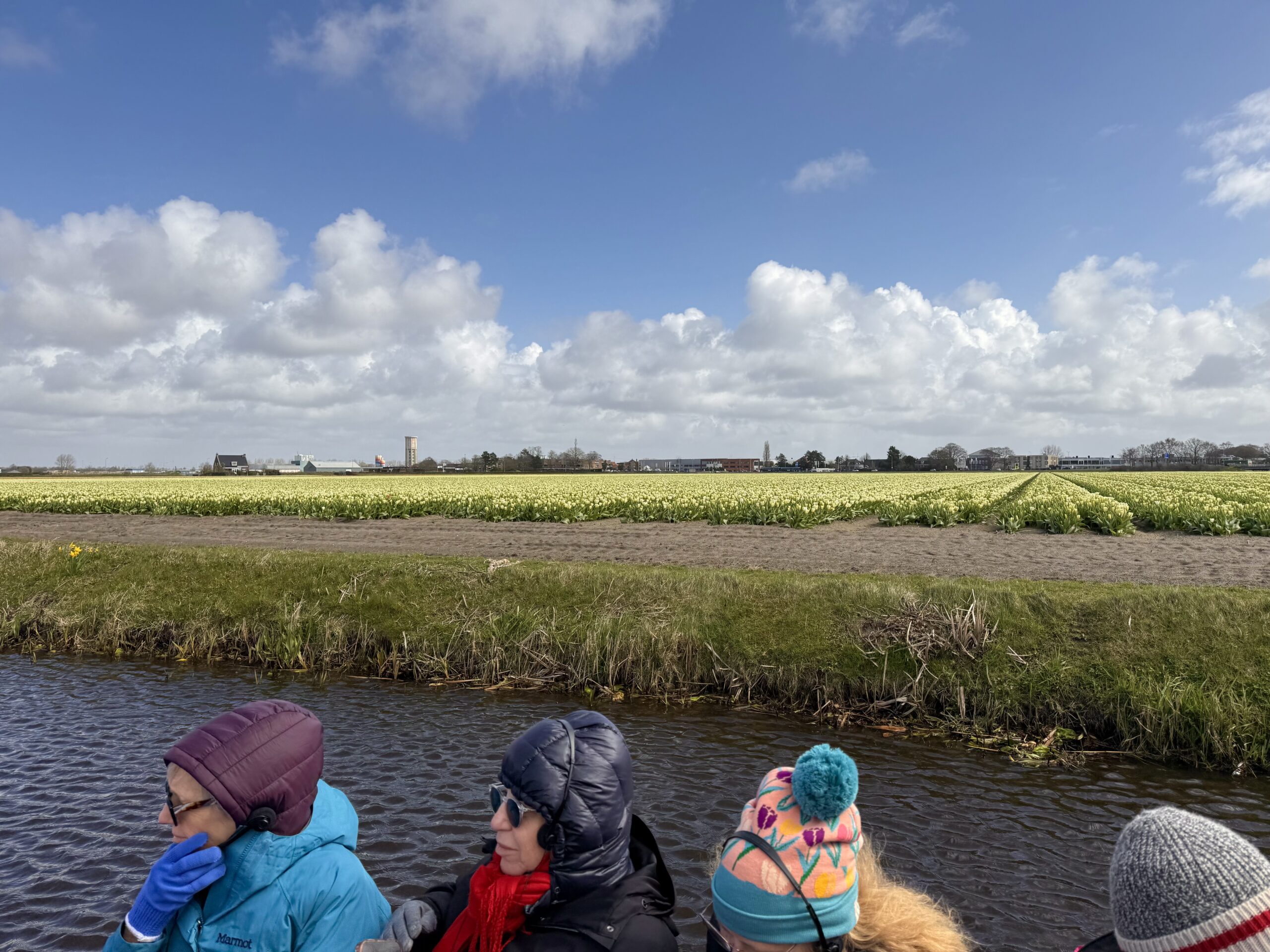 Boat Ride – At the edge of the garden, we climbed into a canal boat to navigate through fields of tulips, daffodils, and hyacinths. Workers cut flowers daily for commercial sales. It was cold, and we even survived a brief hail shower.