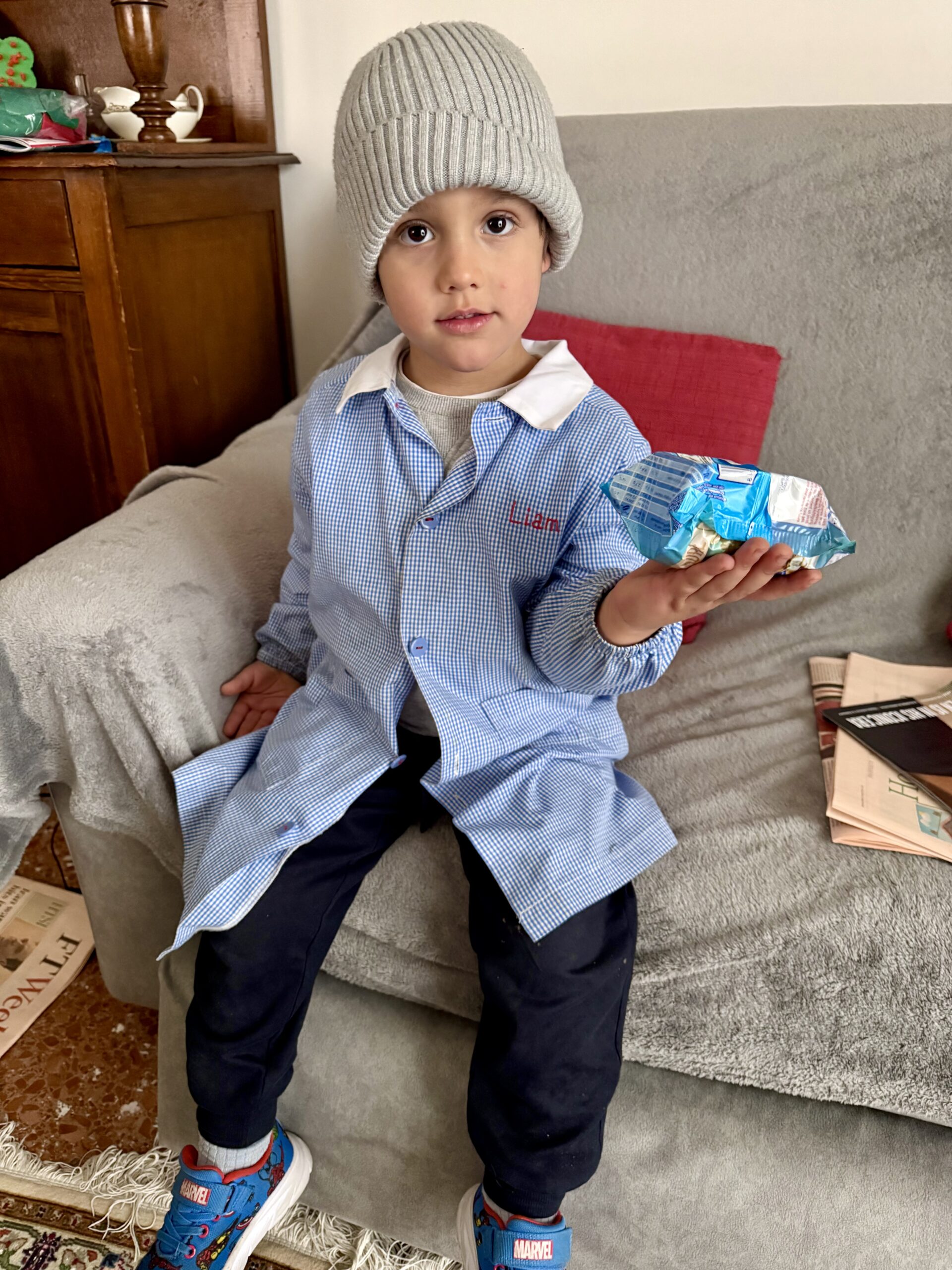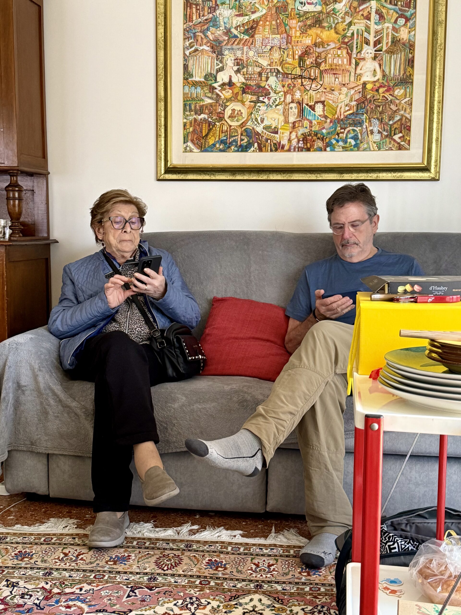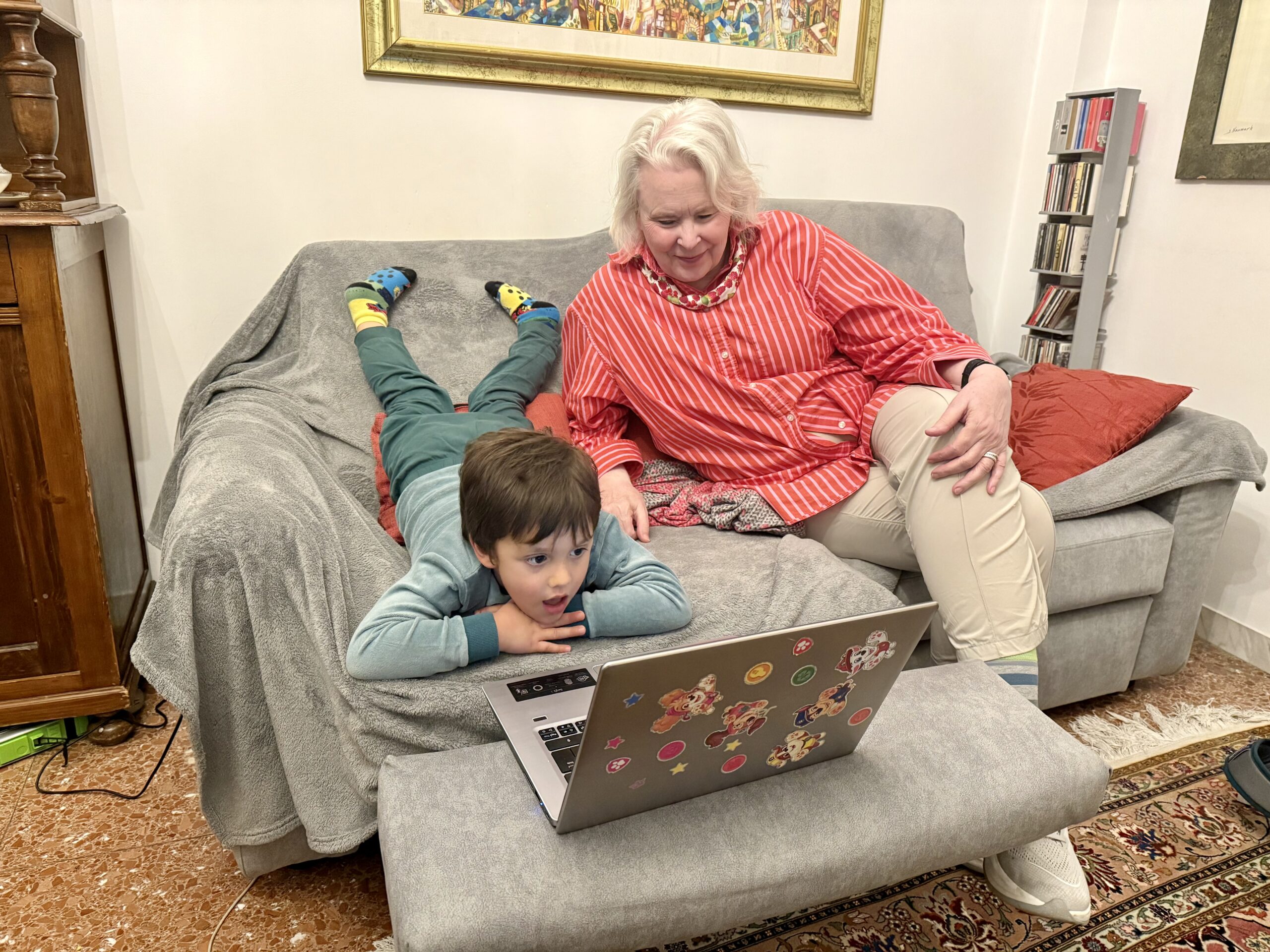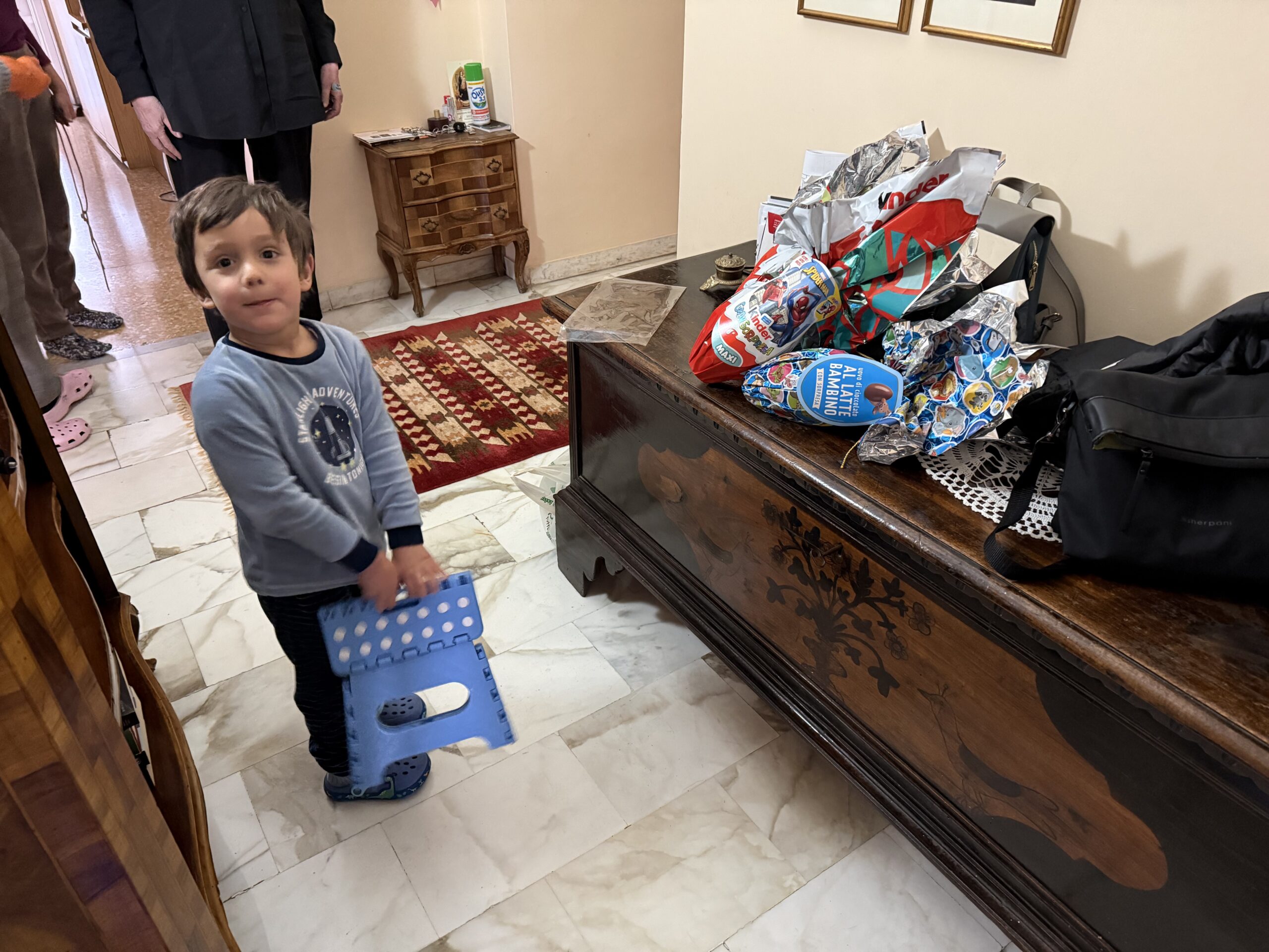 Kitty: You remember our cousins, the sisters Adriana and Luciana Sabbatini. And now Luciana’s daughter Marta and her almost four-year-old son Liam have moved in with Luciana so things are lively. Toys everywhere. In addition, Luciana’s son Dario flew in from southern France to spend Easter with all of us.