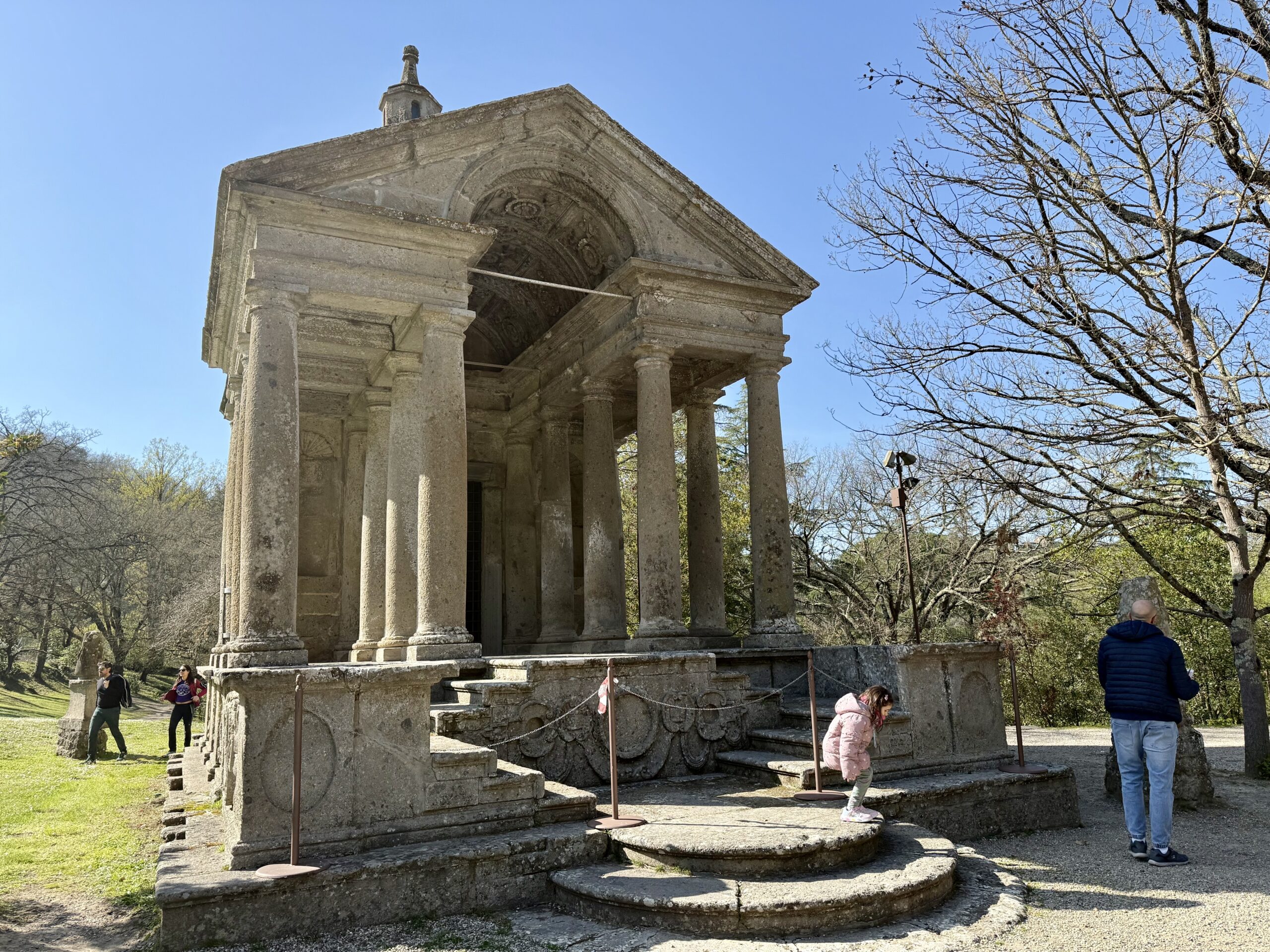 Created in the 16th century, the park’s style is Mannerist, a reaction to the ideals of the Renaissance. Instead of emphasizing beauty, refinement, proportion, balance, and nature, the park’s design exaggerates an unnatural elegance that is not in scale within itself or with its surroundings. Crudely fashioned, grotesque sculptures and small buildings populate the natural wooded vegetation along a small stream. A fun stroll.