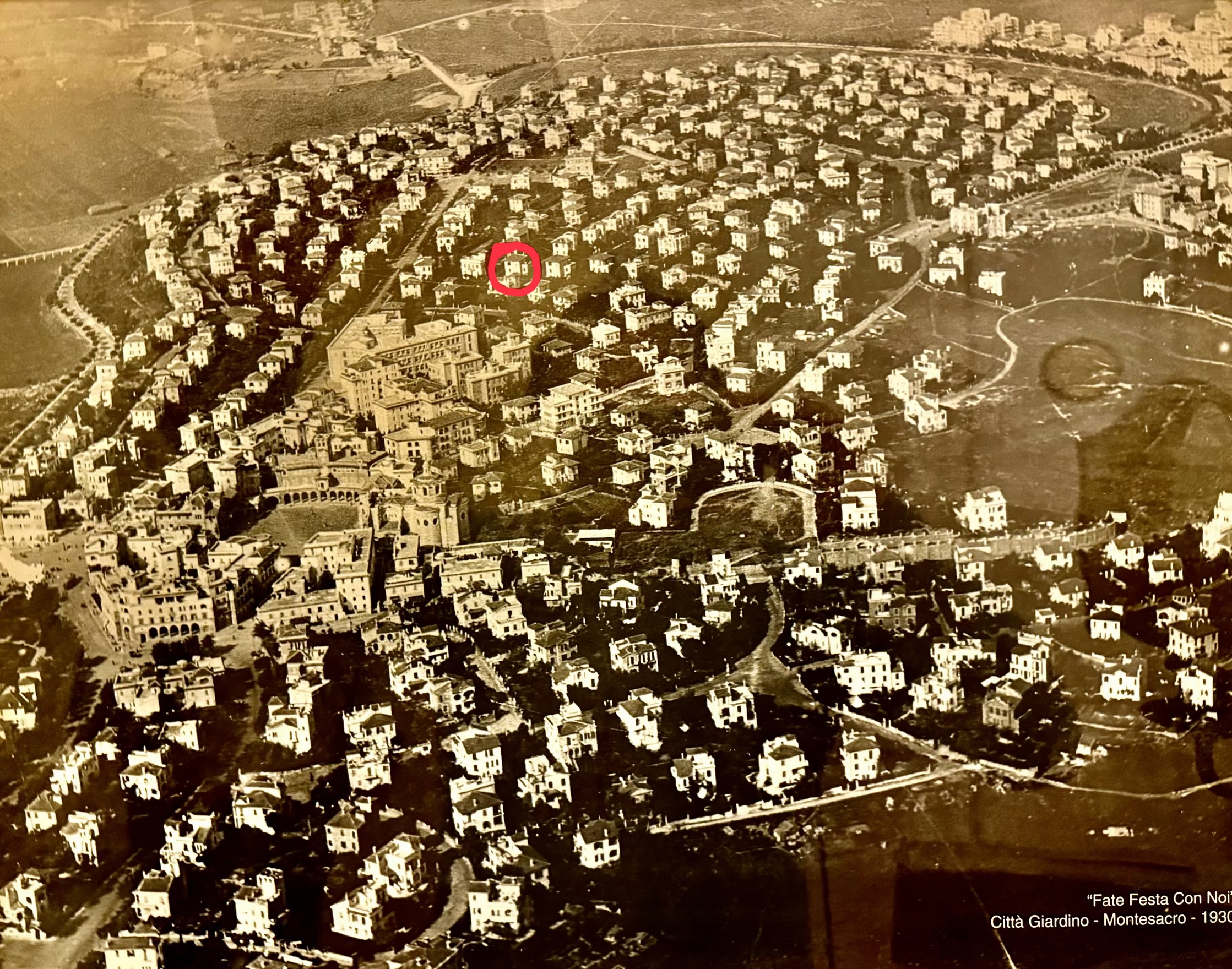 1930 aerial of Montesacro, a planned garden city in its infancy. The red circle identifies where we stayed. The area is now full of trees and vegetation and many of the original villas have been replaced with small apartment buildings.