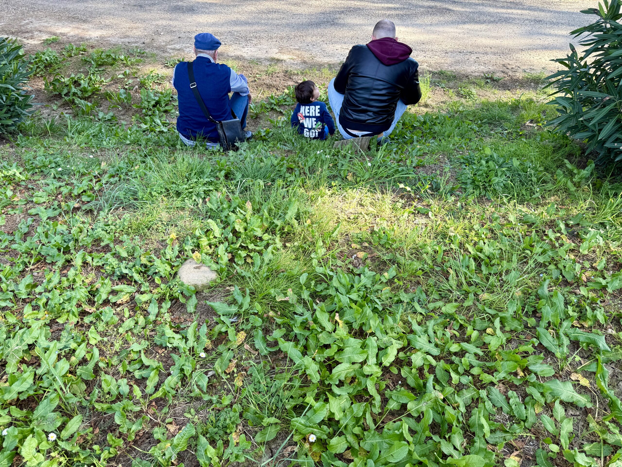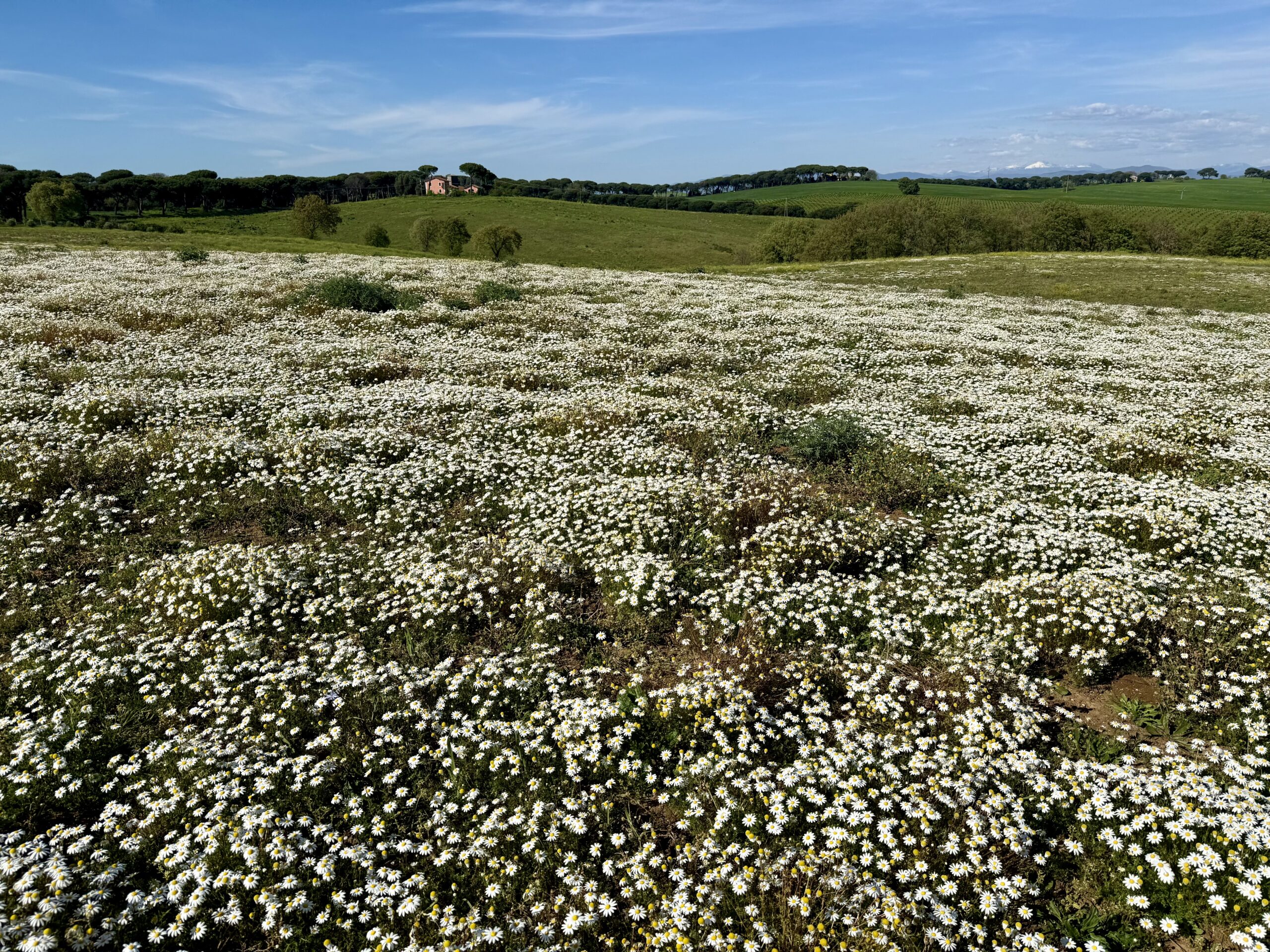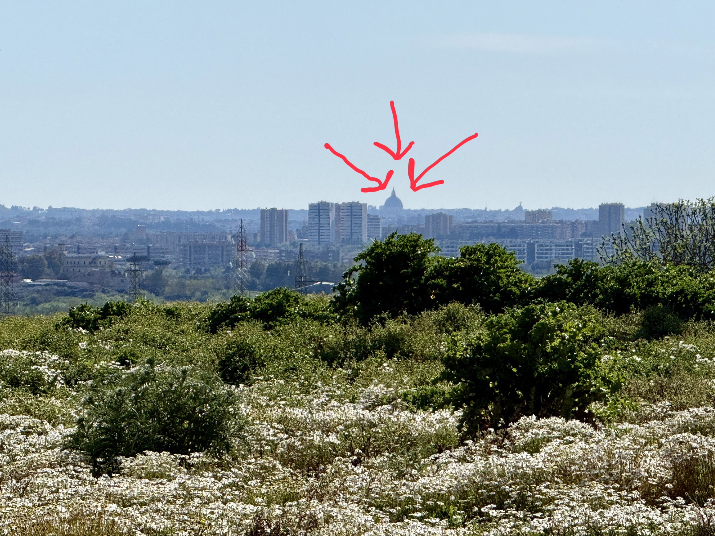 All of this made its way to our table, beginning with an extensive array of appetizers followed by a pasta, a meat course (our choice was lamb, of course), and dessert. Patrons bring their own wine because the Muslims do not serve alcohol. Luciana often comes here to buy cheese and olive oil and brings Liam for some exercise outdoors. After the lunch, we strolled across a field of white flowers. At the crest of the hill we could easily see the Vatican.