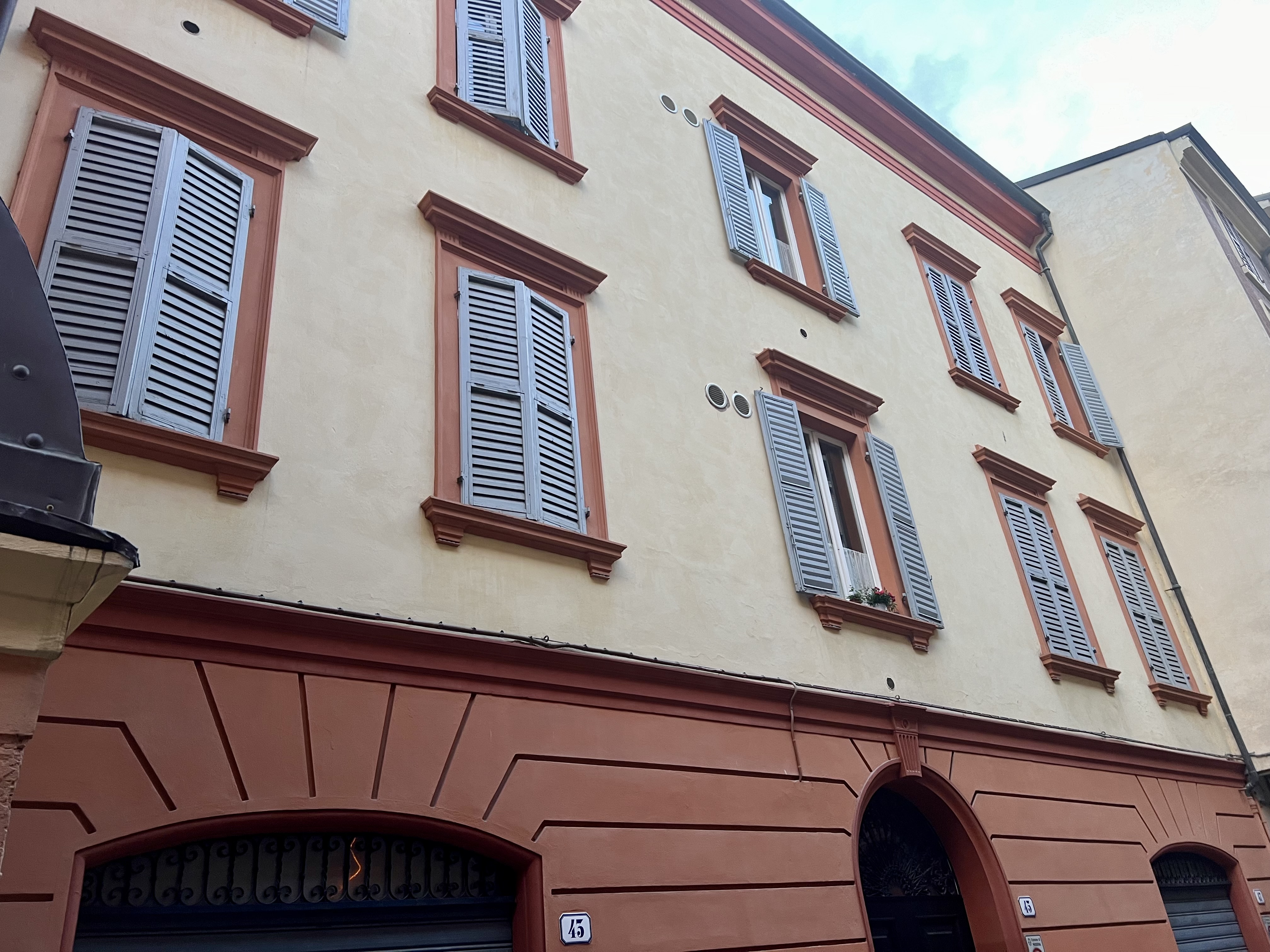 In Italian cities we have visited so far, buildings are one or two colors. We noticed in Modena, however, that buildings (and swag for sale at the Ferrari museum) usually combine three colors: dark red, pale blue-gray, and yellow gold. Very distinctive.