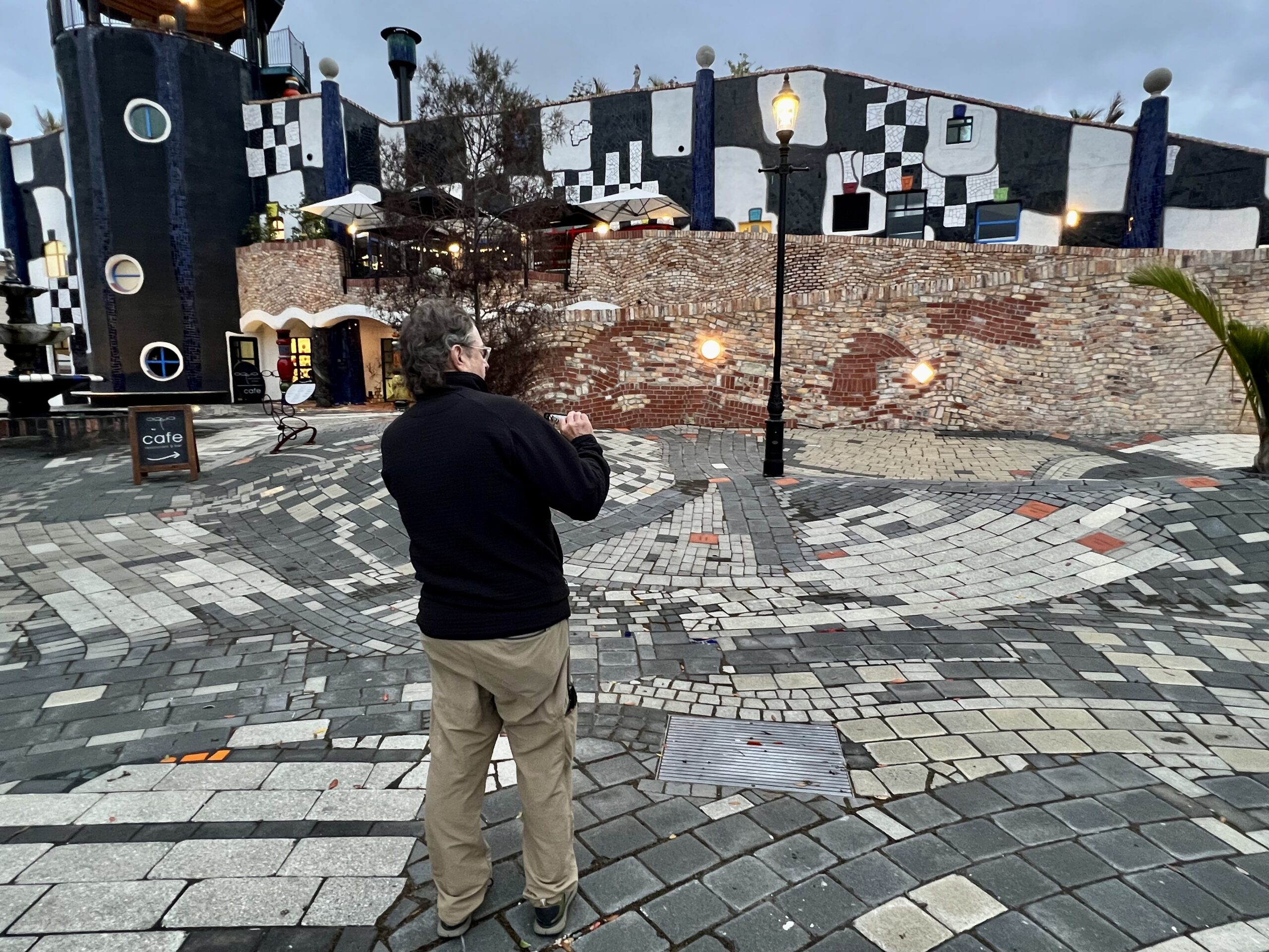 The harborside is well designed with a variety of areas for play and relaxation. It also has a great art gallery designed by and later dedicated to Friedensreich Hundertwasser. We ran across his work at the Quixote Winery in Sonoma with Eileen, Richard, and Bob last year. Never got a true understanding of his work until now. Although he was born pre WWII in Austria, he made his home in New Zealand in the 1970s. He trained as a painter, later entering the field of architecture in the 1950s. His work is a sort of pop artist rendition of Klimt. Maybe. The museum is small and very manageable for a two-hour visit. The roof is planted because Hundertwasser was a huge proponent of treating roofs this way. Robert wonders why he never made it to the College of Environmental Design at UCB back then. It would have been a very interesting lecture.